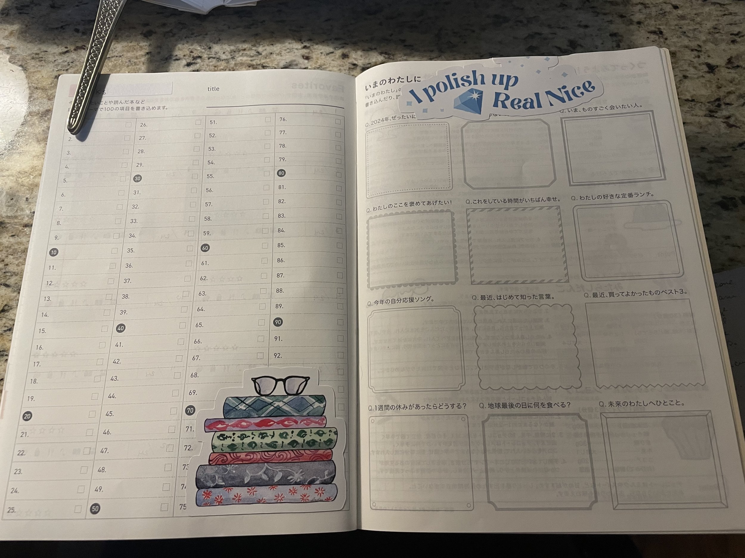 Books on the left. Self care goals on the right.